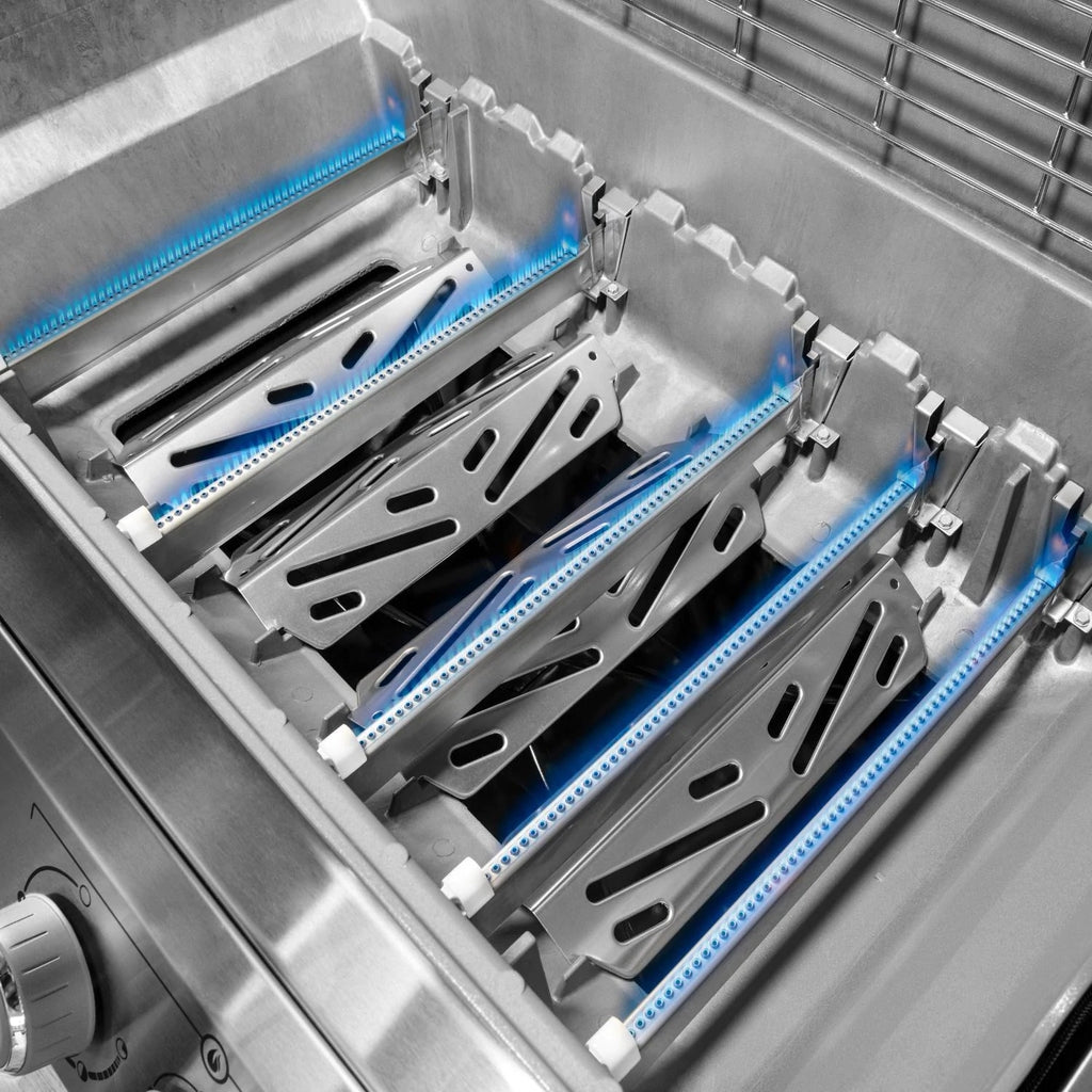- GS4 high performance grilling system featuring infinity ignition, high-performance burners, stainless steel flavorizer bars with flame view window and a grease management system